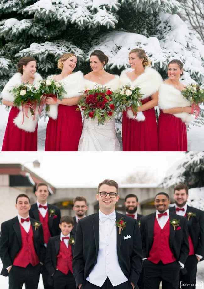 If you decide on a white traditional gown and tux you can still add in the holiday colors and texture. Use Green or red velvet shoes for you and the bridal party. This is a great way to add in some holiday colors and it will look amazing.