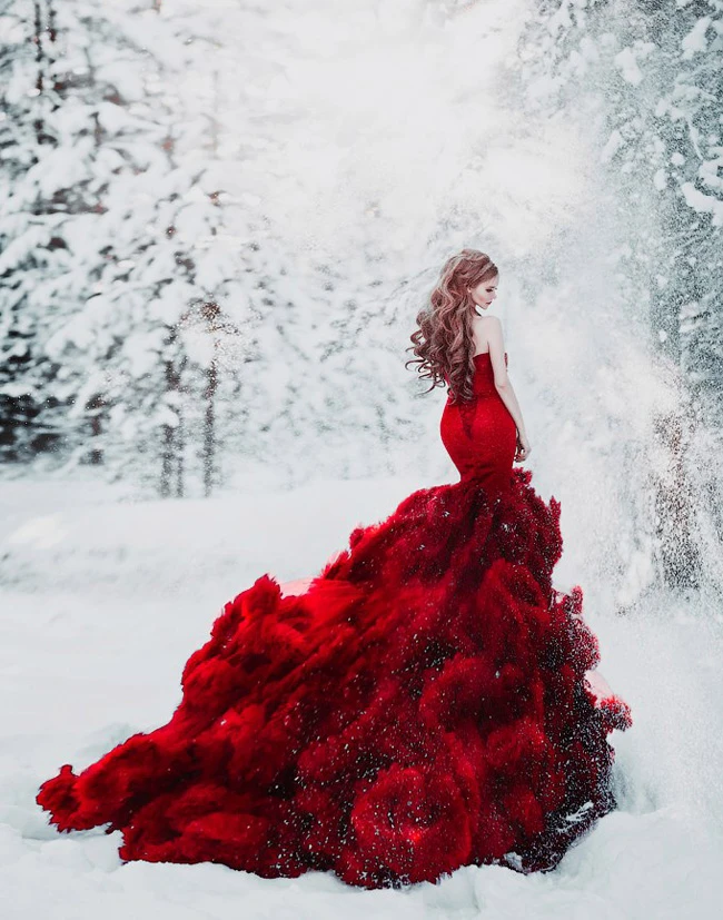 If you are a Christmas bride, you may be looking for inspiration to find that perfect gown. Colored wedding gowns are becoming super popular, especially for a Christmas wedding. Pick a color to stand out in white snow or pale winter colors. The number one color for Christmas is red, green or emerald is another traditional color for Christmas, gold is one more great color and you may also try silver. However, you might prefer the more traditional bridal color white, take a look at something with lace, sequenced, long veil, and use a Fur shawl.